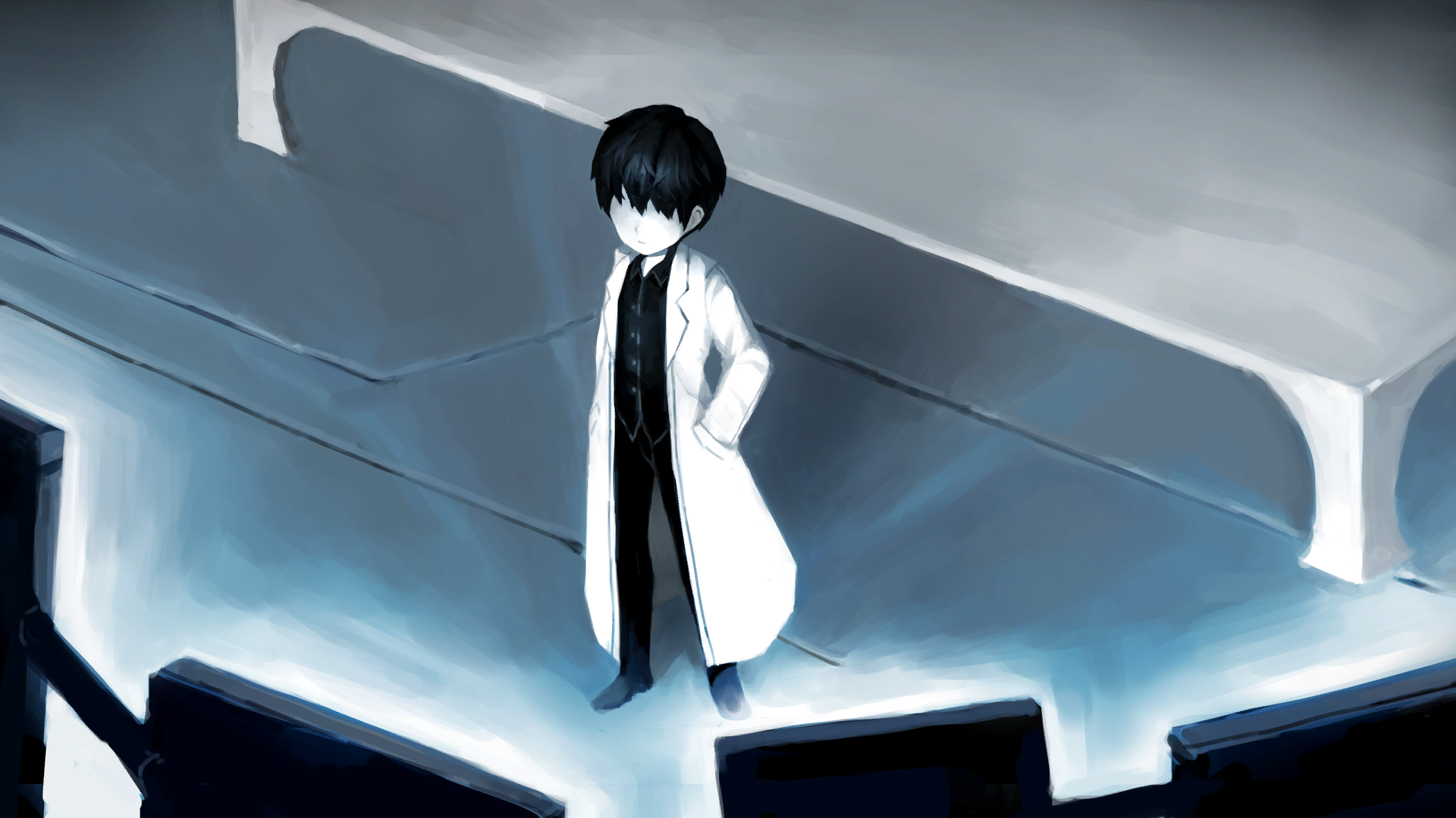 A has short, black hair, yellow eyes, and wears almost completely black attire with a shirt, belt, pants, and shoes. His lab coat is worn over the top of everything. The letter 'A' is just the shortened version of his actual name.