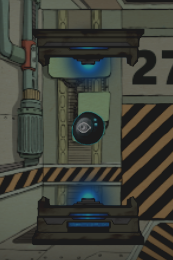 TETH Abnormality in the form of a circular black device with a white eye symbol on the middle and seems to have 2 blue light buttons at the borders. It is contained in a tank, floating in the middle when not in use.