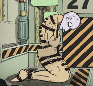 The dignity of a straitjacketed death row inmate wasn't something worth keeping intact, so no one felt guilty for him even as his brain rotted. Now the straitjacket is nothing but an accessory to the hatred and anger that remains. Employees who feel a constricting pain while wearing this suit must undergo a thorough psychological examination." |