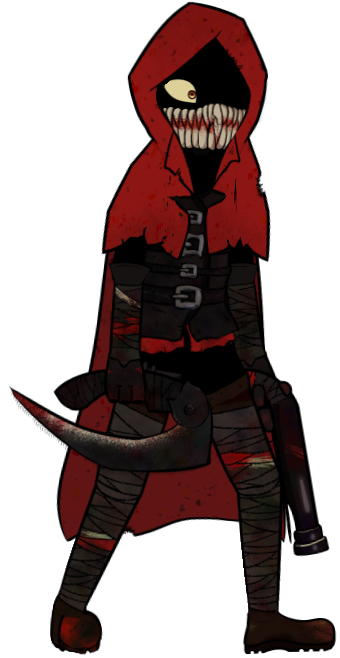 Little Red Riding Hooded Mercenary (F-01-57), or Little Red for short, is a humanoid Abnormality in the form of a female mercenary. Along with black clothes and bandages, she wears a red hood and covers half her face with a teeth-like mask. Only a single yellow eye can be seen from her face. She has several scars on her body, and seems to have blood near her feet. When in combat, she wields shotgun-like pistols, and a scythe-like dagger.