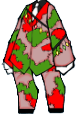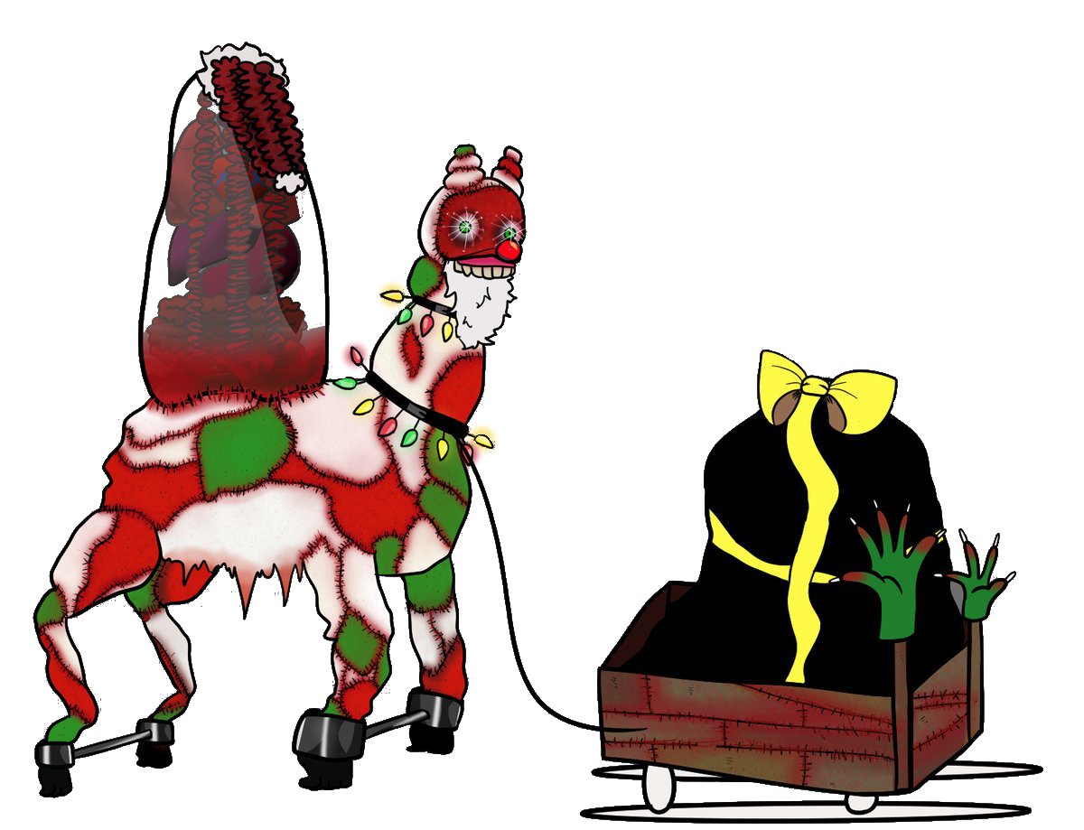 Santa appears as transparent flesh stitched atop Rudolph's back, containing both blood and human organs that are said to still be functional. Part of the intestines within it seem to spill out from its top, forming a Christmas hat.