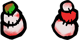 The sleigh is connected to the Christmas lights around Rudolph's neck. It's brown and held together by more stitch-work. It has two white runners and two green hands with clawed tips mounted on its front. The sleigh carries a black bag tied with a yellow ribbon, which moves in its in-game sprite.