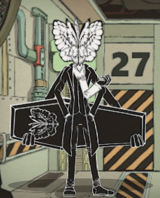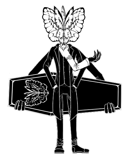 The Funeral of the Dead Butterflies (T-01-68) is a humanoid Abnormality which has a white butterfly for a head and possesses five arms, two at each shoulder and one coming from its neck. It wears a black suit and coat with a single white sleeve for its middle arm. It carries a black coffin with a butterfly engraved on its lid behind its back with two of its arms. According to the flavor text, the coffin is full of butterflies.